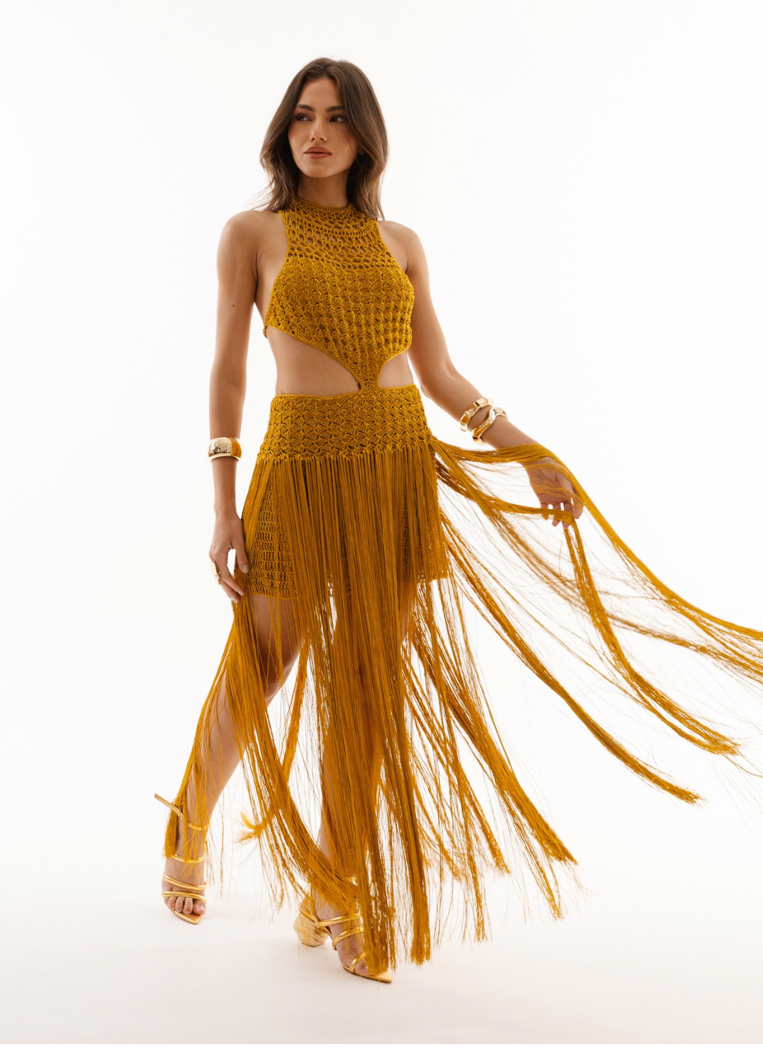 O Vestido Aventino é uma peça autoral feita à mão em crochê, em um tom dourado vívido que destaca a presença. Longo e inteiramente composto por franjas, ele traz movimento e impacto, com recorte estratégico na cintura e diferentes pontos em crochê que sobem até o pescoço. As costas têm fechamento aberto, e a peça conta com uma saia interna de crochê por trás das franjas, oferecendo segurança e camadas.